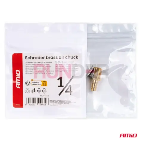 AMIO Adaptér na huštění pneumatik – Ventily Schrader (AV) je mosazná hlavice pro rychlé a těsné připojení na automobilové ventily Schrader. Odolné mosazné tělo zaručuje dlouhou životnost a spolehlivou přilnavost i při častém dílenském použití. Vhodné pro osobní, dodávkové a nákladní vozidla, motocykly a jízdní kola se Schrader (AV) ventilem.