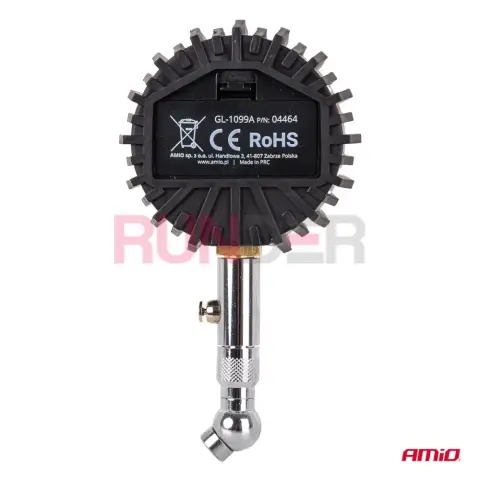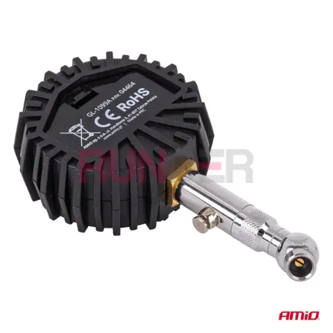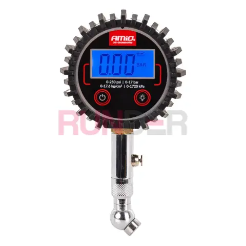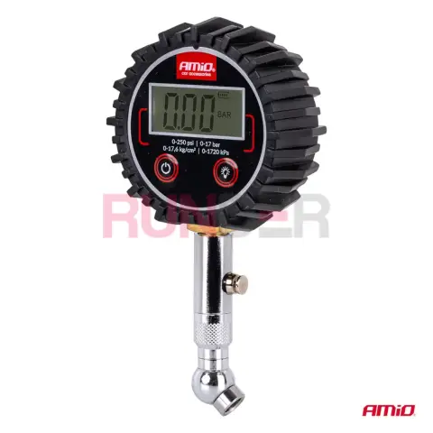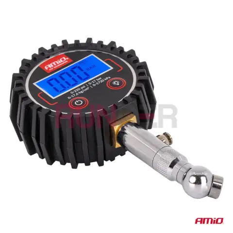 AMIO digitální manometr je přesné a praktické měřidlo tlaku pneumatik s otočnou hlavicí a rychlým odvzdušňovacím ventilem. Digitální displej poskytuje čitelné výsledky do 17 bar (≈ 246,6 psi / ≈ 17,34 kgf/cm²), otočná hlava usnadňuje přístup k ventilům v těžko dostupných místech a odvzdušňovací ventil umožňuje jednoduchou korekci tlaku bez nutnosti odpojení přístroje.