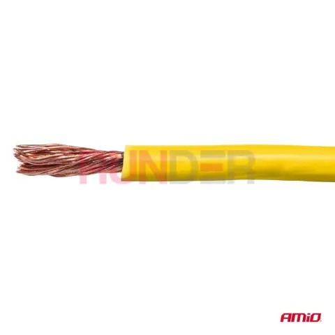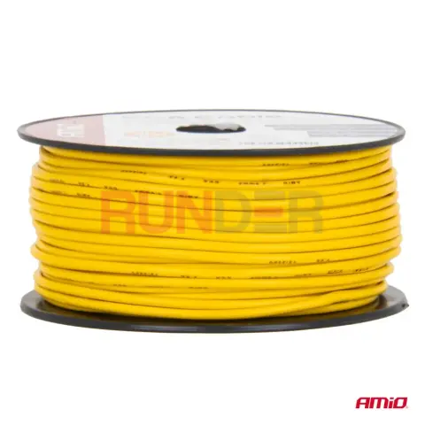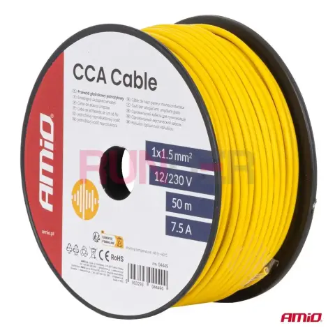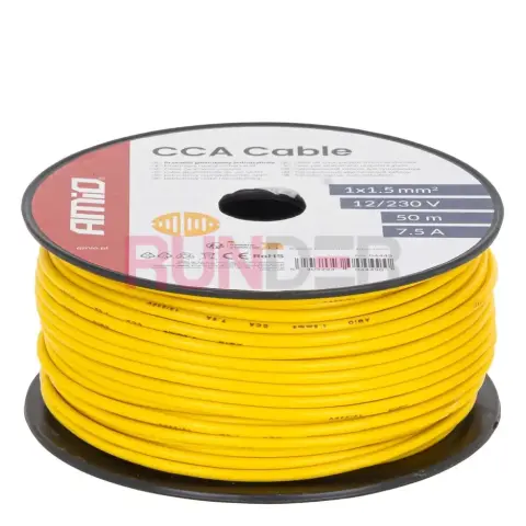 AMIO Jednožilový vodič reproduktoru CCA 1x1,5 mm² 50 m 7,5 A 12/230 V – žlutý je univerzální jednožilový kabel vyrobený v technologii CCA (Copper Clad Aluminium), určený pro jednoduché instalace nízkého i síťového napětí. Se žlutou izolací pro lepší identifikaci a praktickou délkou 50 m na cívce je ideální pro menší montážní projekty, autorádia, rozvody 12 V a jednoduchá elektrická vedení 230 V při nižších proudech.