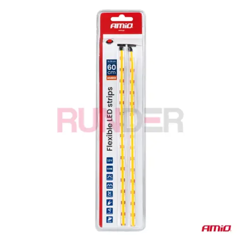 AMIO COB LED pásky jsou flexibilní pásky s technologií COB (Chip On Board) určené pro montáž v automobilech a jiných vozidlech s napájením 12 V. Sada obsahuje dva pásky po 30 cm, které emitují intenzivní amber (bursztynové) světlo s velmi souvislým a rovnoměrným světelným pásem typickým pro COB. Díky pružné konstrukci se pásky snadno přizpůsobí tvaru montážní plochy a zabudovaná funkce „try me“ usnadňuje prodejní prezentaci.