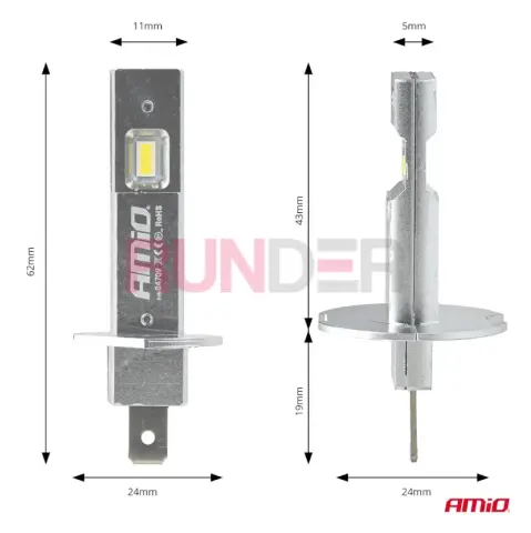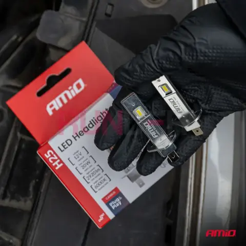 AMIO LED žárovky hlavního svícení – Série H25 CANBUS H1, 12 V, 20 W jsou kompaktní LED náhrady halogenů H1 s vysokou světelnou účinností a integrovaným CANBUS (anti-error) modulem pro minimalizaci chyb „žárovka vypálená“. CSP diody nové generace vytvářejí koncentrovaný a rovnoměrný kužel se studenou bílou barvou ~6000 K.