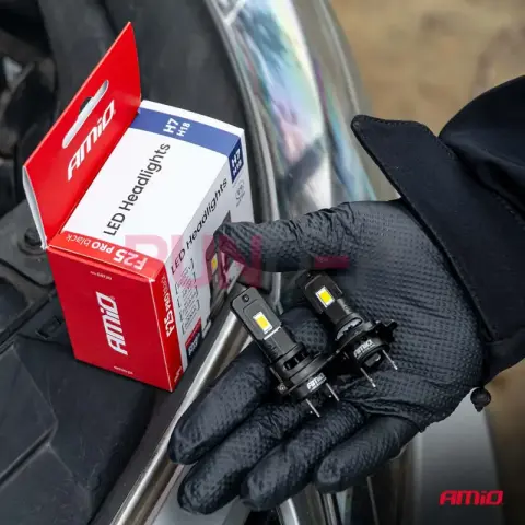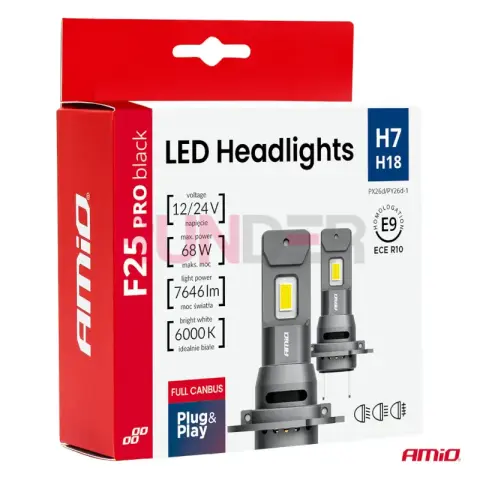 AMIO LED žárovky hlavního svícení – Série F25 PRO BLACK FULL CANBUS H7, 68 W, 12/24 V přinášejí vysoký jas a rovnoměrný světelný kužel při nízké spotřebě. FULL CANBUS pomáhá předejít chybovým hlášením o „vypálené žárovce“ a zajišťuje širokou kompatibilitu s moderními vozidly.