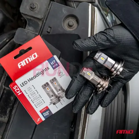 AMIO LED žárovky hlavního svícení – Série H25 CANBUS H7/H18, 12 V, 30 W jsou kompaktní LED náhrady halogenů s integrovaným CANBUS (anti-error). CSP diody nové generace poskytují ~6000 K studenou bílou a rovnoměrný, přesně fokusovaný kužel při deklarovaném toku ~2710 lm – ideální do světlometů s omezeným prostorem.