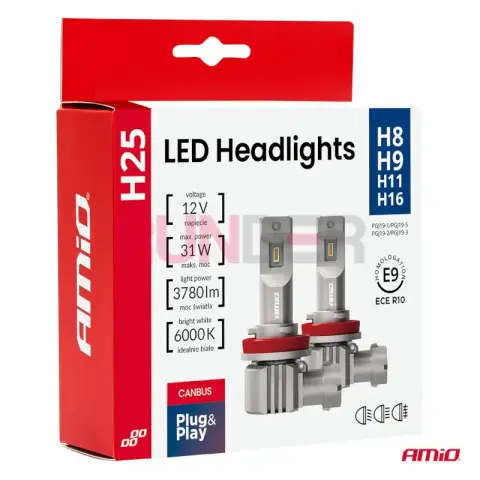 AMIO LED žárovky hlavního svícení – Série H25 CANBUS H8/H9/H11/H16, 12 V, 31 W jsou kompaktní LED náhrady halogenů s integrovaným CANBUS (anti-error). CSP diody nové generace poskytují ~6000 K studenou bílou a rovnoměrný, přesně fokusovaný kužel při deklarovaném toku ~3780 lm – ideální do reflektorů s omezeným prostorem.