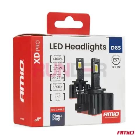 AMIO XD PRO D8S FULL CANBUS jsou moderní LED žárovky navržené jako přímá náhrada xenonových výbojek D8S. Díky nejnovější generaci CSP diod poskytují velmi silné, stabilní a přesné osvětlení vozovky. Barva světla 6500 K přináší čistý bílý „LED efekt“ a systém FULL CANBUS pomáhá eliminovat chybová hlášení i blikání v moderních vozidlech.