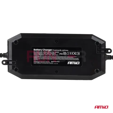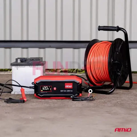 Profesionální digitální nabíječka pro osobní i užitková vozidla, stroje a zemědělskou techniku. Podporuje 12 V i 24 V systémy, má výstup až 10 A (12 V), udržování napětí (float) a regeneraci (desulfaci). IP65 krytí, možnost přišroubování na zeď a rychlospojka s přídavným kabelem s očky pro trvalé připojení.