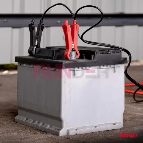 Připojte svorky: červená (+) na kladný pól, černá (−) na záporný pól (nebo kostru).