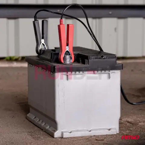 Připojte svorky: červená na (+), černá na (−) (nebo na kostru vozidla).