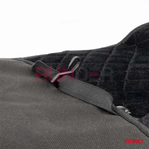 Umístěte potah na sedadlo, protáhněte elastické upevňovací pásy kolem opěradla a spodní části sedadla a pevně je upevněte. Zkontrolujte, zda bederní opěrka sedí ve správné výšce podle vaší anatomie. Během montáže upravte pozici tak, aby potah nepřerušoval bezpečnostní pásy ani přístup k ovládacím prvkům.