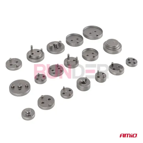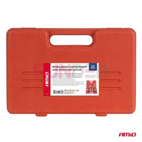 AMIO 22dílná sada na brzdové pístky je specializované nářadí pro profesionální servis brzd. Umožňuje rychlé a bezpečné zatlačování i otáčení (závitové) brzdových pístků v třmenech – tedy pro přední třmeny (zatlačované) i zadní třmeny, kde se pístek často musí zároveň otáčet (integrovaná ruční brzda). Ideální při výměně brzdových destiček a údržbě kotoučových brzd.