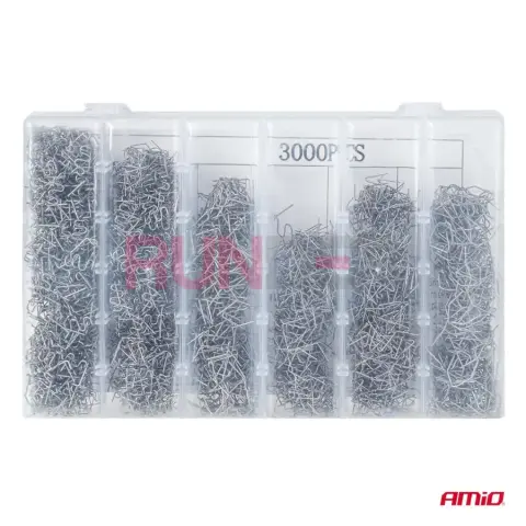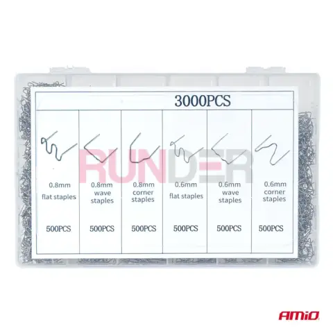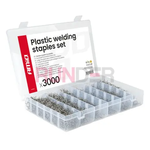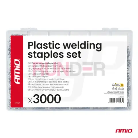 AMIO sada spon na opravu plastů 3000 ks je velké balení spon určených k zpevňování a opravám prasklých plastových dílů pomocí svářečky/plastové sešívačky (spojování plastu sponami). Spony umožňují rychlé a pevné vyztužení poškozených míst na dílech karoserie i interiéru – například na náraznících, plastových krytech, držácích nebo panelech.