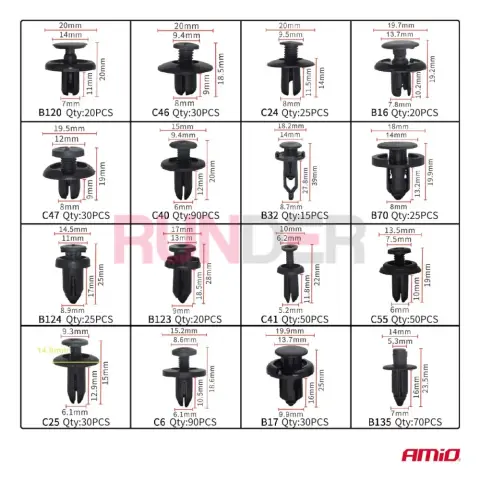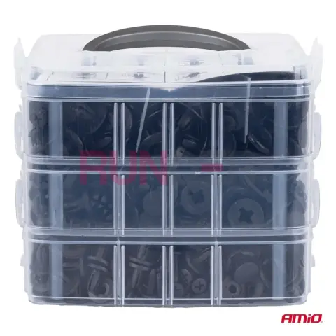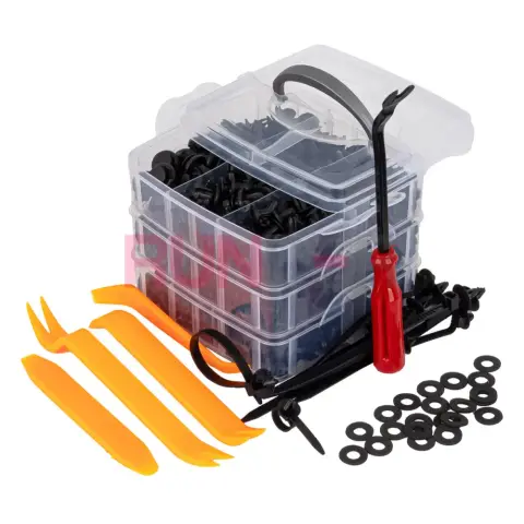 Univerzální sada upevňovacích prvků, klipů, kolíků a nástrojů k jejich demontáži – celkem až 650 kusů, zabalených v praktickém organizéru. Ideální pro opravy a výměny plastových a čalouněných dílů v automobilech, motocyklech, čtyřkolkách či užitkových vozidlech.