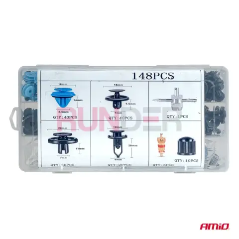 AMIO sada spon a příchytek s nářadím (148 ks) je praktický komplet pro rychlou montáž i demontáž plastových dílů v autě. Set obsahuje mix spon, klipů a montážních kolíků spolu s nástroji, které usnadňují vyjímání panelů a příchytek bezpečněji – bez zbytečného poškození čalounění, lišt nebo plastových krytů.
