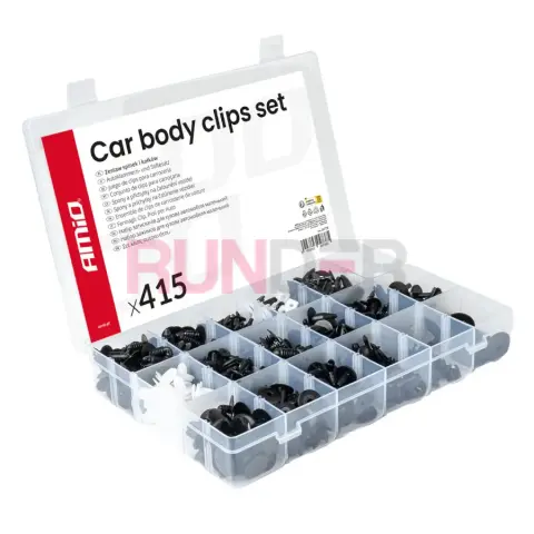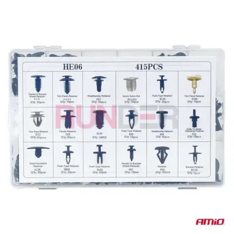 AMIO sada spon a příchytek 415 ks je velký univerzální set určený pro opravy, servis a montáž plastových dílů v autě. Obsahuje široký mix spon, klipů a montážních kolíků, které se používají při upevňování čalounění, panelů, lišt, podběhů a různých plastových krytů. Díky vysokému počtu kusů je ideální jako dílenská zásoba pro časté demontáže a opravy.