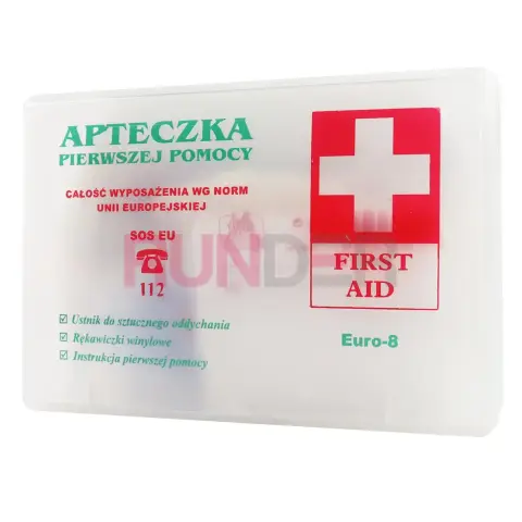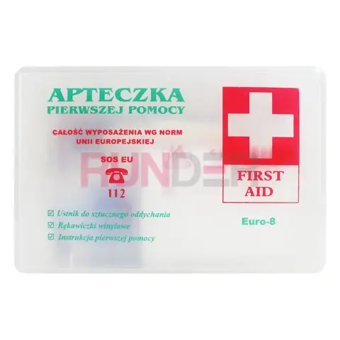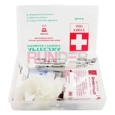 Autolékárnička DIN 13164 (TYP B / Euro-8) je kompaktní a kompletní souprava první pomoci navržena podle požadavků evropských norem pro motorová vozidla. Balení je pevné, průhledné s mírně mléčným odstínem a jednoduchým dvoubarevným potiskem — ideální do auta, dodávky nebo na pracovní stroje.