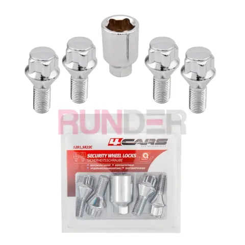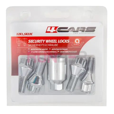 Bezpečnostní šrouby kol (12x1,5x22C), sada na 4 kola + klíč OPEL VECTRA 09/88-08/03 SIGNUM 05/03- MERIVA 03/03- ZAFIRA 03/99-09/01 ASTRA 09/01-02/04 CORSA 09/87-10/00 SAAB 9-3 03/98 -09/02 9-5 09/97- 9000 08/95-12/98 DAEWOO NEXIA 03/95-12/00 LANOS 06/97- NUBIRA 09/97-06/03 FIAT ULYSEE 05/99-08/02 SCUDO 01/96-02/04