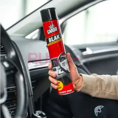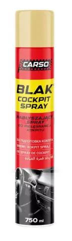 CARSO BLACK COCKPIT SPRAY je připravený sprej pro čištění a oživení vnitřních plastových, vinylových a gumových povrchů vozidla. Rychle odstraňuje prach, mírné nečistoty a zbytky mastnoty a zároveň dodává povrchům hluboký černý lesk bez lepkavého zbytku.