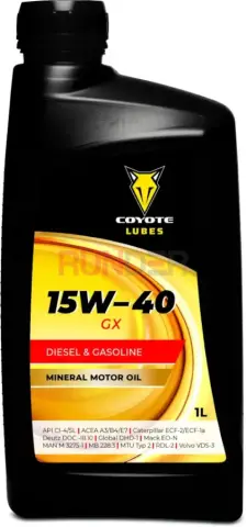 COYOTE LUBES 15W-40 GX 1L je celoroční vícestupňový minerální motorový olej viskozity SAE 15W-40 se specifikacemi API CI-4/SL, ACEA A3/B4/E7 a širokou škálou OEM norem, který je ideální pro benzínové i dieselové motory osobních, užitkových a pracovních vozidel, zajišťuje vysokou ochranu proti opotřebení, udržuje motor čistý a spolehlivě funguje i v náročných provozních podmínkách.
