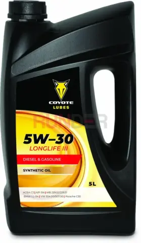 COYOTE LUBES 5W-30 Longlife III je syntetický longlife motorový olej viskozity SAE 5W-30 se specifikací ACEA C3 a normami API SN, VW 504.00/507.00, MB 229.31/229.51, BMW LL-04 a Porsche C30, který je určen pro moderní benzinové, naftové i plynové motory, chrání DPF a výfukový systém, snižuje tření a spotřebu paliva a zároveň zajišťuje vysokou čistotu a dlouhou životnost motoru.