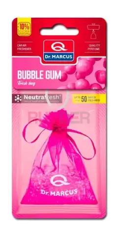 DR. MARCUS FRESH BAG - Sáčková vůně Žvýkačka (Bubble Gum) je hravý závěsný osvěžovač vzduchu ve formě malého textilního sáčku naplněného polymerovými kuličkami. Sladké, typické „žvýkačkové“ aroma připomínající dětství a bonbóny skvěle oživí interiér auta, šatníku i koupelny a dodá mu svěží, zábavnou atmosféru.