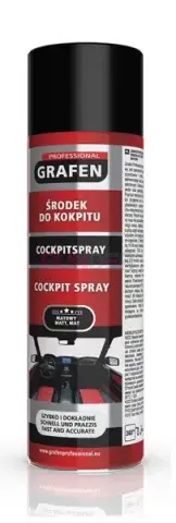 GRAFEN Cockpit Cleaner MATT je speciální čisticí sprej určený k ošetření palubních desek, plastových a vinylových povrchů v interiéru vozidla. Zanechává dlouhotrvající matný finiš, odstraňuje prach a běžné nečistoty, snižuje usazování nového prachu a obnovuje přirozený vzhled povrchů bez nežádoucího lesku.