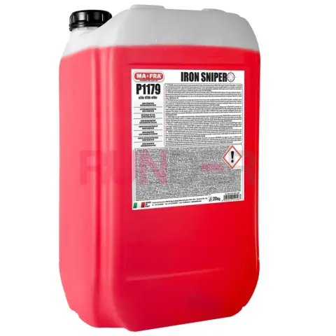 MA-FRA IRON SNIPER je vysoce koncentrovaný profesionální přípravek určený k chemické dekontaminaci vozidel, který efektivně odstraňuje železité usazeniny, brzdový prach a průmyslový spad. Je určený k ředění, což umožňuje přizpůsobit jeho intenzitu podle úrovně znečištění. Při reakci s kovovými nečistotami se zbarvuje do fialova a má charakteristický zápach síry, což je přirozený důsledek chemického procesu.
