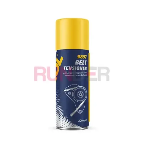 MANNOL BELT TENSIONER je speciální sprej určený k péči o hnací řemeny v motorových vozidlech. Rychle a efektivně odstraňuje pískání a skřípání způsobené prokluzováním, čistí boční plochy řemene od nečistot a olejových stop, obnovuje pružnost materiálu a vytváří ochrannou vrstvu, která snižuje stárnutí a praskání řemenic. Díky tomu zvyšuje spolehlivost a životnost řemenového pohonu a snižuje hlučnost motoru.