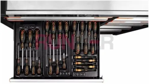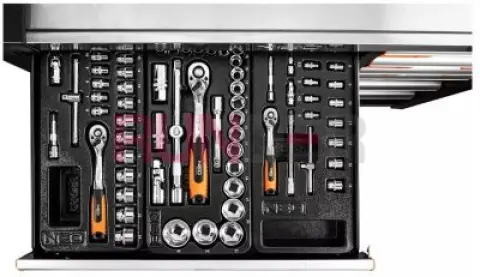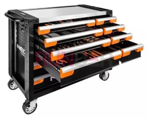 Odolná a prostorná dílenská skříň PRO od značky NEO s 229 prvky a 12 zásuvkami ve čtyřech různých velikostech. Sestava se skládá ze šesti velkých zásuvek (3 nízké o rozměrech 56 x 40 x 6 cm a 3 vysoké o rozměrech 56 x 40 x 13,9 cm) a šesti malých (3 nízké o rozměrech 25,25 x 40 x 6 cm a 3 vysoké, rozměry: 25,25 x 40 x 13,9 cm). Má pevné ocelové tělo a hliníkový vrch s místy pro šroubováky. Boční perforace umožňuje instalaci háčků a dalšího příslušenství NEO.