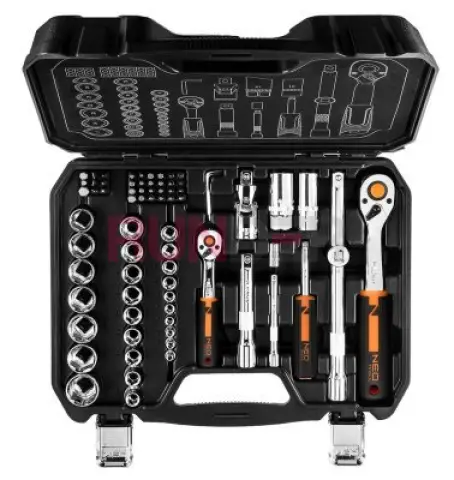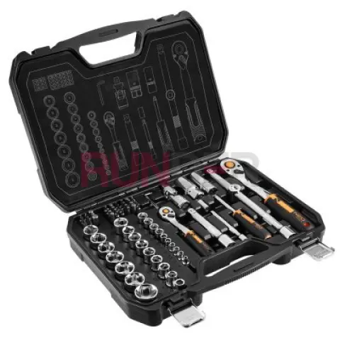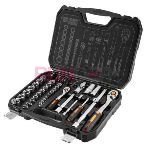 Nástrčné klíče ½", ¼", sada 73 kusů, CRV, 10-054 NEO je kvalitní sada 73 produktů, nabízená v pohodlném plastovém kufříku s kovovými západkami a praktickou rukojetí. Vertikální umístění prvků v něm zaručuje větší komfort používání a rychlejší sběr potřebného příslušenství. Sada obsahuje následující nástroje a příslušenství:
