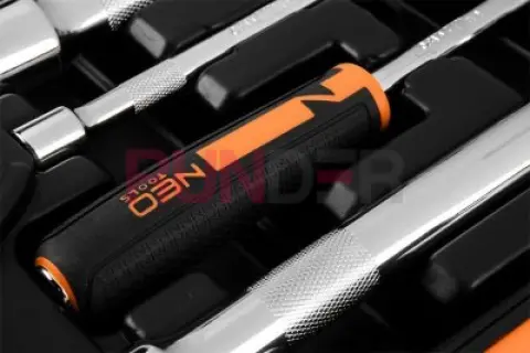Nářadí nabízené v sadě je vyrobeno z kvalitní chrom-vanadiové oceli. Vyznačují se také novým designem rukojetí - protiskluzový materiál na ráčně s převahou černé barvy a přídavkem oranžové barvy je praktickým řešením, které dobře poslouží v každé dílně.