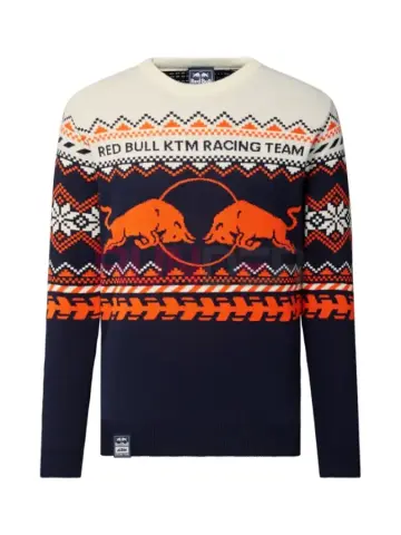 Stylový pletený svetr z vánoční edice pro fanoušky Red Bull KTM Racing Team. Má klasický kulatý výstřih, dlouhý rukáv a výrazný zimní vzor s logem Red Bull a nápisem RED BULL KTM RACING TEAM – ideální na svátky, zimní vyjížďky i běžné nošení.