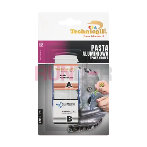 TECHNICQLL Aluminium Epoxy Paste je dvousložková, vysokopevnostní epoxidová pasta se zesílením skleněnými vlákny, navržená pro opravy a zpevnění kovových dílů. Po vytvrzení tvoří tvrdý, kovově vypadající materiál s vynikající mechanickou odolností — lze jej vrtat, závitovat, brousit a malovat, takže výsledek působí profesionálně.