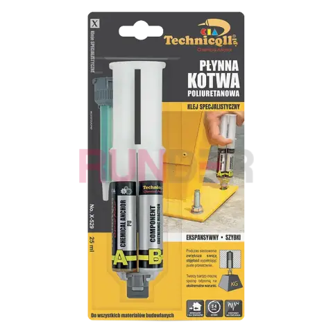 TECHNICQLL CHEMICAL ANCHOR je dvousložková polyuretanová kotva, určená pro profesionální i domácí použití při kotvení a upevňování prvků s vysokou nosností. Během vytvrzování mírně zvětšuje svůj objem, čímž dokonale vyplní dutiny a nerovnosti a vytvoří extrémně pevné spojení bez napětí v základním materiálu. Po vytvrzení má strukturu podobnou dřevu, což umožňuje jednoduché opracování – vrtání, broušení či řezání.