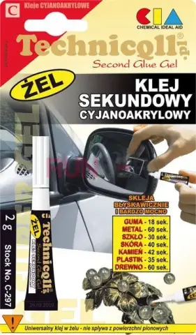 TECHNICQLL CIA Gel je tixotropní, rychleschnoucí sekundové lepidlo v gelové formě, navržené pro spoje na vertikálních a savých površích. Díky gelové konzistenci neproteče při aplikaci, rychle vytvoří pevný, bezbarvý a téměř neviditelný spoj a hodí se na kovy, plasty, elastomery, keramiku i dřevo.