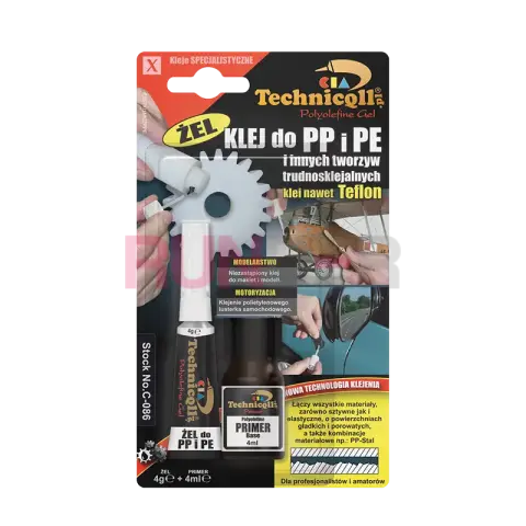 TECHNICQLL Gel for PP and PE je speciálně navržený systém pro lepení obtížně spojitelných materiálů, jako jsou polyolefiny (PP, PE) a porézní povrchy. Součástí balení je primer, který zvyšuje povrchové napětí plastů, a modifikovaný kyanoakrylátový gel, který umožňuje pevné a trvanlivé spoje.