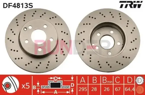 TRW DF4813S je přední, větraný a perforovaný brzdový kotouč s povrchovou úpravou (lakovaný/-coated), určený jako náhradní díl pro osobní vozidla (např. různé modely Mercedes-Benz). Kotouč kombinuje dobrou odvod tepla (díky ventilaci) s vrtaným profilem pro lepší výkon při brzdění.