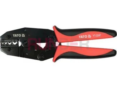 Kleště YT-2247 pro krimpování koncových konektorů, s černým povrchem, který chrání proti korozi a dvousložkovými plastovými kryty rukojeti. Tvrdší PP komponent namontovaný přímo na nástroji pevně přilne k tělu a vnější TPR část je příjemná na dotek a má protiskluzové vlastnosti. Ráčnový mechanismus umožňuje rychlé a přesné upnutí bez použití nadměrné síly.