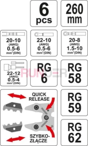 • pět výměnných matric pro lisování nejběžnějších typů konektorů, vč. neizolované, izolované, svorka, objímka, anténní konektory