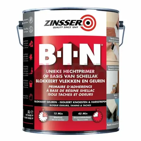 ZINSSER BIN – Rychleschnoucí šelakový základní nátěr na dřevo a stěny, blokátor skvrn a zápachu, 1L je profesionální bílý sealer/primer na bázi šelaku (alkoholová báze) pro interiér a bodové použití v exteriéru. Extrémně rychle schne, spolehlivě blokuje nejodolnější skvrny a zápachy a vyniká přilnavostí bez broušení i na velmi hladkých površích (sklo, glazované dlaždice, staré emaily). Sjednocuje nasákavost a připraví podklad pro perfektní krytí vrchních nátěrů.